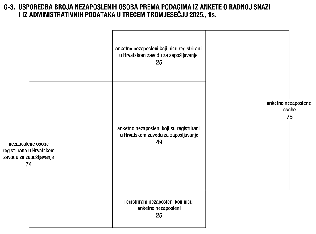 Usporedba podataka o nezaposlenima dobivenih Anketom o radnoj snazi s podacima Hrvatskog zavoda za zapošljavanje (HZZ-a) i drugih statističkih praćenja temeljenih na administrativnim izvorima pokazuje da je u trećem tromjesečju 2025. stopa nezaposlenosti prema podacima administrativnih evidencija (4,0%) bila niža od stope anketne nezaposlenosti (4,2%). U tom razdoblju prosječan broj nezaposlenih prema Anketi o radnoj snazi bio je veći za tisuću osoba od podataka Hrvatskog zavoda za zapošljavanje. Budući da su se anketirane osobe izjašnjavale o prijavljenosti službi za zapošljavanje, usporedba podataka pokazuje da je od ukupno 75 tisuća nezaposlenih prema Anketi o radnoj snazi, njih 49 tisuća ili 66,0% bilo prijavljeno službi za zapošljavanje, dok 34,0% anketno nezaposlenih nije bilo zainteresirano za prijavu službi za zapošljavanje. Istodobno, od ukupno 74 tisuće registriranih u Hrvatskom zavodu za zapošljavanje, njih 25 tisuća ili 33,9% nije zadovoljilo međunarodne kriterije nezaposlenosti.