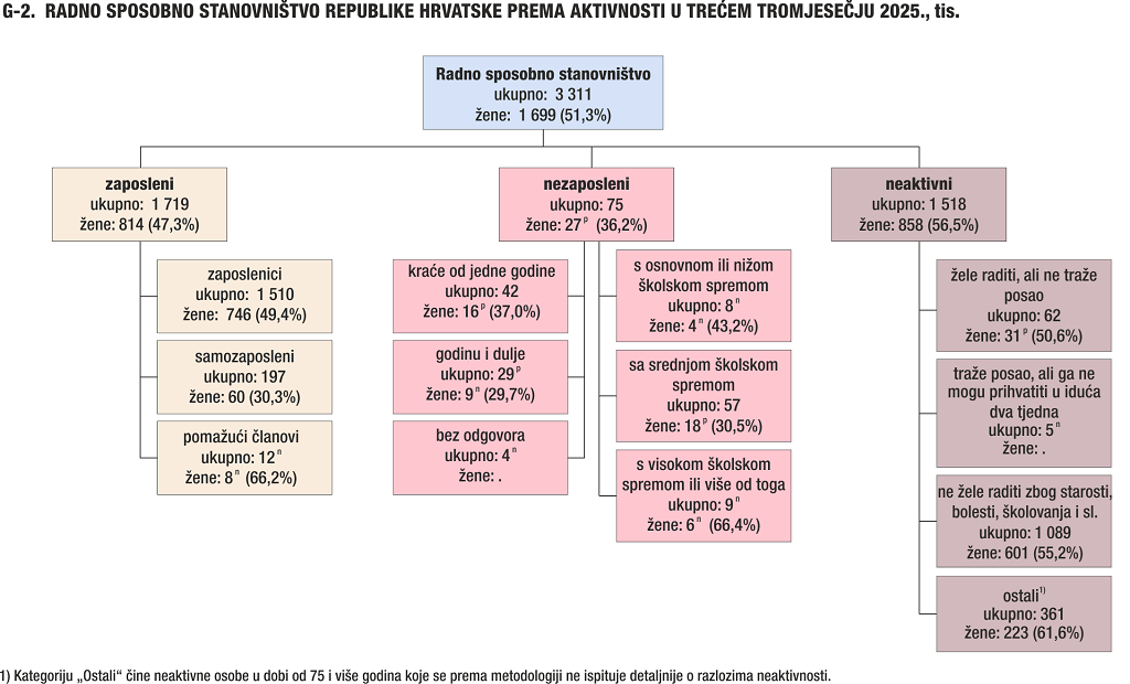 Procjenjuje se da je u trećem tromjesečju 2025. u Republici Hrvatskoj bilo 1 719 tisuća zaposlenih osoba, što je porast za 28 tisuća, odnosno za 1,6% u odnosu na treće tromjesečje 2024. U istome promatranom razdoblju broj nezaposlenih osoba u Republici Hrvatskoj iznosio je 75 tisuća, što je pad za 13 tisuća, odnosno za 15,3% u odnosu na treće tromjesečje 2024.