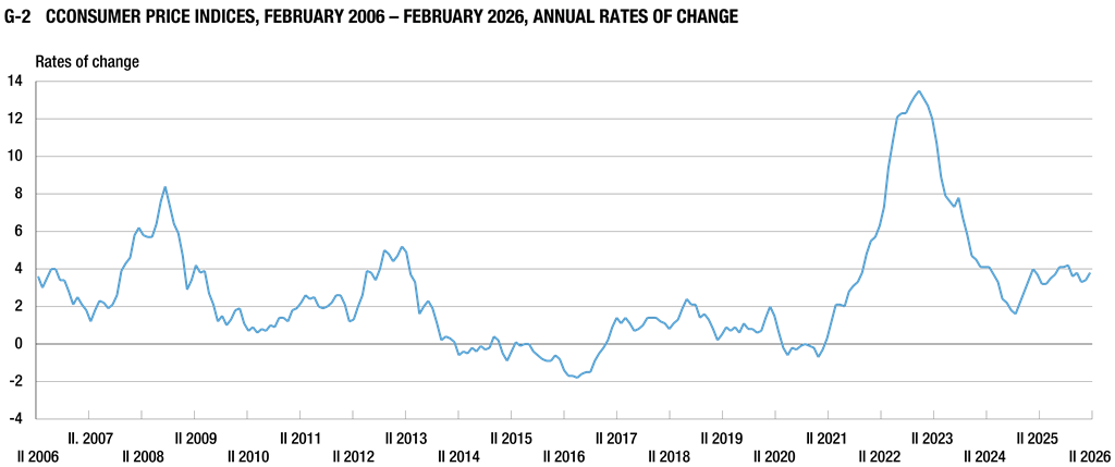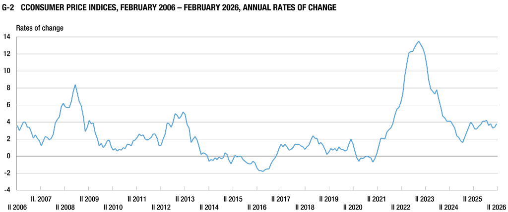 In February 2026 compared to February 2025 (at the annual level), the prices of goods and services for personal consumption, measured by the consumer price index, increased by 3.8% on average, while, compared to January 2026 (at the monthly level), they increased by 0.3% on average.