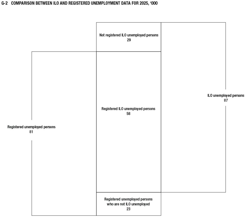 The comparison of unemployment data obtained by the Labour Force Survey with those according to the Croatian Employment Service (CES) and those obtained from other administrative data records shows that the average unemployment rate in 2025, according to the administrative records, was lower (4.5%) than the ILO unemployment rate (4.9%). In the same period, the average number of unemployed persons according to the Labour Force Survey was six thousand persons higher than the number obtained from the CES. Since interviewed persons provided information on their registration with the CES, the data comparison shows that 58 thousand, or 66.7%, out of a total of 87 thousand unemployed persons, were registered with the CES, 33.1% of persons who were classified as unemployed in the Labour Force Survey were not interested in registering with the CES, and the remaining 0.2% did not respond to the question on registration. At the same time, 23 thousand, or 28.6% of a total of 81 thousand persons who were registered with the CES did not fulfil the international criteria of unemployment.