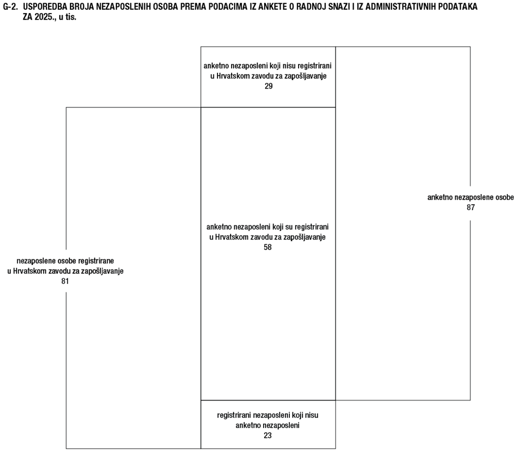 Usporedba podataka o nezaposlenima dobivenih Anketom s podacima Hrvatskog zavoda za zapošljavanje (HZZ-a) i drugih statističkih praćenja temeljenih na administrativnim izvorima pokazuje da je prosječna stopa nezaposlenosti u 2025. prema podacima iz administrativnih evidencija bila niža (4,5%) od stope anketne nezaposlenosti (4,9%). U tom je razdoblju prosječan broj nezaposlenih prema Anketi bio veći za šest tisuća osoba u usporedbi s podacima HZZ-a. Budući da su se anketirane osobe izjašnjavale o prijavljenosti službi za zapošljavanje, usporedba podataka pokazuje da je, od ukupno 87 tisuća nezaposlenih prema Anketi, njih 58 tisuća ili 66,7% bilo prijavljeno službi za zapošljavanje, 33,1% anketno nezaposlenih nije bilo zainteresirano za prijavu službi za zapošljavanje, a preostalih 0,2% nije odgovorilo na pitanje o prijavljenosti. Istodobno, od ukupno 81 tisuću registriranih u Hrvatskom zavodu za zapošljavanje, njih 23 tisuće ili 28,6% nisu zadovoljavale međunarodne kriterije nezaposlenosti.